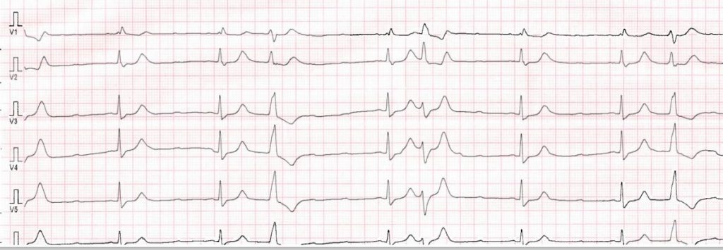 Na podstawie powyższego zapisu wysunięto podejrzenie bloku przedsionkowo-komorowego III stopnia z dodatkowymi ekstrasystoliami komorowymi.