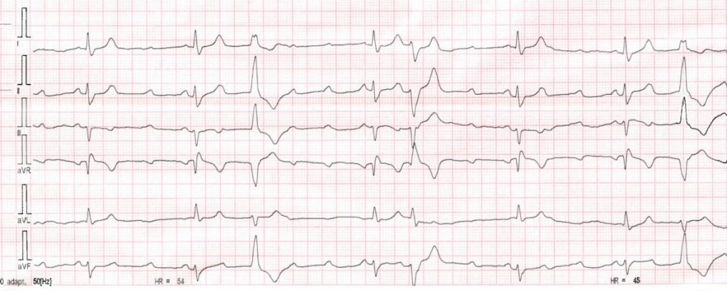 56-letni pacjent zgłosił się do POZ, ponieważ żona powiedziała mu, że podczas pomiarów ciśnienia aparat pokazuje mu, że ma bardzo niskie tętno – około 35–40 uderzeń/minutę. Wartości ciśnienia tętniczego natomiast w granicach 150/90 mmHg.