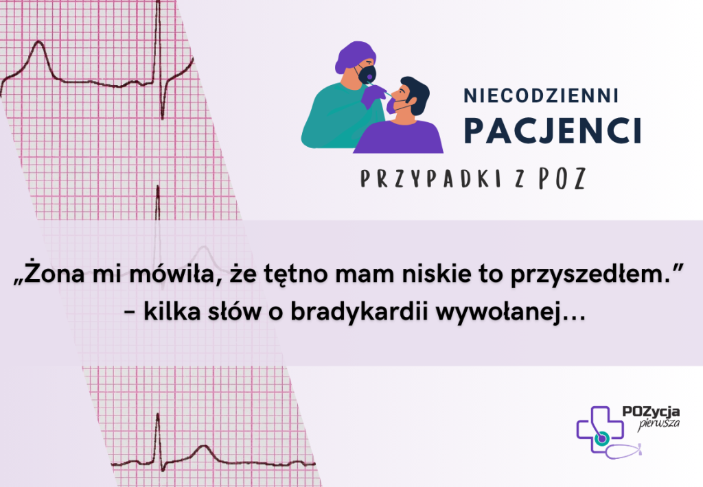 56-letni pacjent zgłosił się do POZ, ponieważ żona powiedziała mu, że podczas pomiarów ciśnienia aparat pokazuje mu, że ma bardzo niskie tętno – około 35–40 uderzeń/minutę. Wartości ciśnienia tętniczego natomiast w granicach 150/90 mmHg.